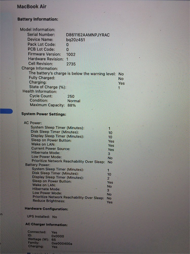 The health of the battery reports as having 82% of its original capacity, with 250 cycles. Due to the machines being previously used, the health of the battery cannot be guaranteed.